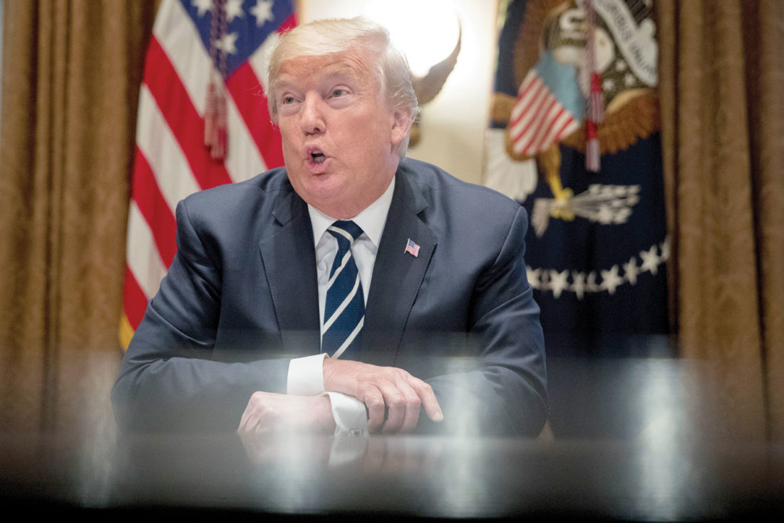 President Donald Trump speaks to members of the media as he meets with members of Congress in the Cabinet Room of the White House, Tuesday, July 17, 2018, in Washington. Trump says he meant the opposite when he said in Helsinki that he doesn’t see why Russia would have interfered in the 2016 U.S. elections. (AP Photo/Andrew Harnik)