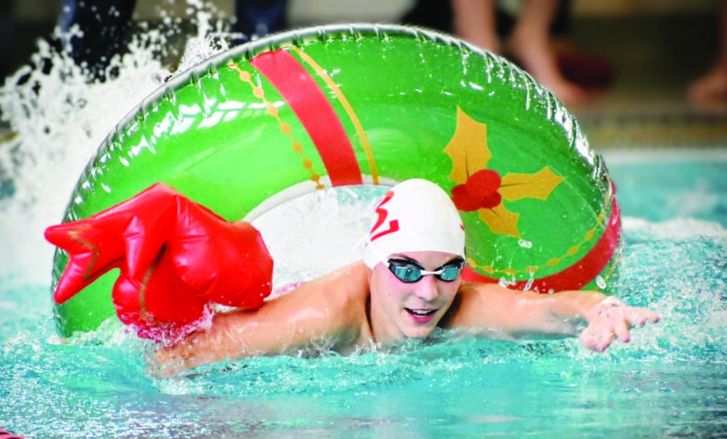 Beaver Local High School freshman Abram Rettos runs his heat in the Christmas Wreath Race Saturday during the inaugural BLHS holiday swim meet at Calcutta YMCA. Five teams competed in a variety of holiday teamed heats during the swim meet that benefited the East Liverpool Elks Christmas toy ...