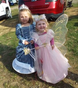 Adalyn Campbell, 5, and Ariel Campbell, 3, daughter of Hailey Bowersox of Chester, take a break in between stopping at treat stations Saturday afternoon at Hilltop Drive-in’s annual trunk or treat held in conjunction with the Revolution Car Club’s Boo Cruise for the drive-in’s 75th anniversary. (Photo by Stephanie Ujhelyi)