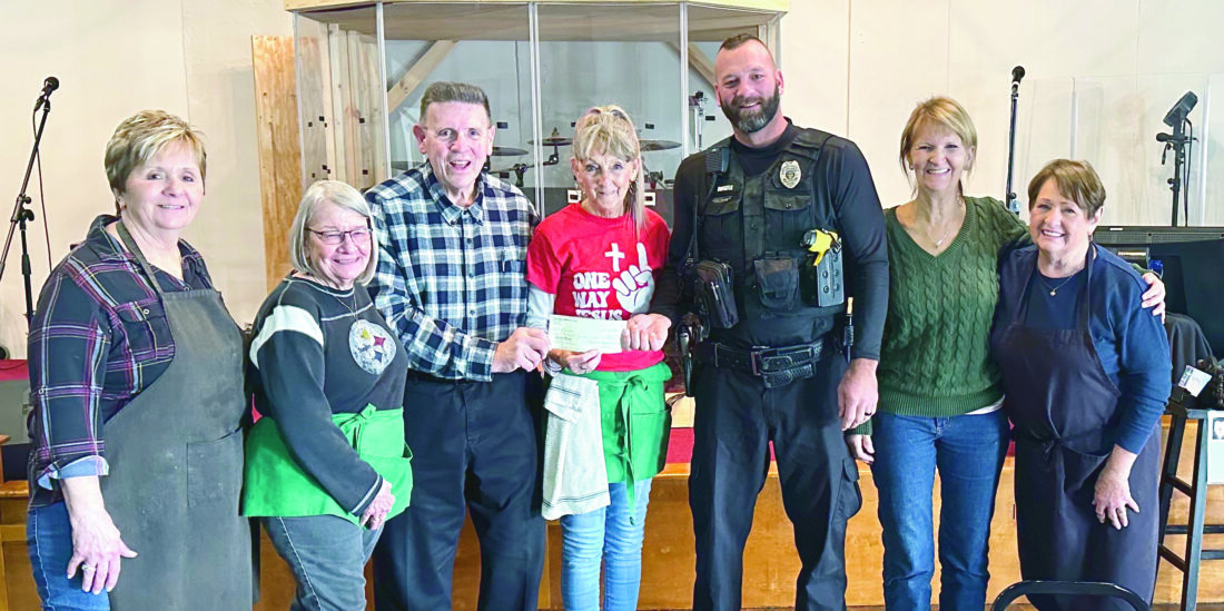 The Fraternal Order of Police, Quaker Lodge #88, Salem, recently donated $1,000 to Elevate Church- Kitchen for Christmas. Pictured from left are Patti Mayhew, Sharon Miller, Retired Sgt. Deputy Kenny Biacco, treasurer Brenda Collins, Patrolman Steve Rodgers representing Wellsville Police Department, Patricia Wolf, and Vondra Rueffner. Wellsville Police Department is now affiliated with Lodge #88 which currently has 72 members. (Submitted photo)