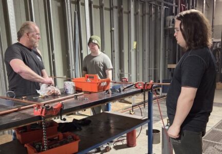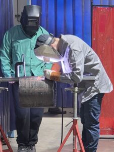 Utica Shale Academy students and staff spent the day exploring real-world career pathways during a field trip on Jan. 14. The excursion included the Youngstown State University Excellence Training Center for a guided tour and students learned about innovative training opportunities and post-secondary options. From there, they headed to the UA Local 396 Plumbers and Pipefitters Union in Boardman for an in-depth, hands-on tour where they gained insight into skilled trades, apprenticeships, and career opportunities in the industry. (Above) Union Training Coordinator Rick Boyarko shows John and Alex Ketchum how to seal pipes at the Boardman facility. (Right) Clinton Greaver is with a union apprentice teaching him welding techniques at the Boardman facility. (Submitted photos)