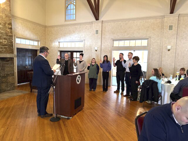 Ohio REALTORS President Mic Gordon administers the oath of office to 2026 officers, from left, President Frank Kostik of Hardcastle Realty, Caitlin Beaver of Hardcastle Realty, Wendy Kittel of The Agency Real Estate, Dana Channels of Cedar One Realty, Raymond Griggy of Keller Williams Chervenic Realty, Zachary Underwood of Underwood & Associates, and Treasurer Linda Courtney of Towne & Suburban Realty. Also elected to vice president was Donald Thompson of Venture Home Real Estate. (Submitted photo)