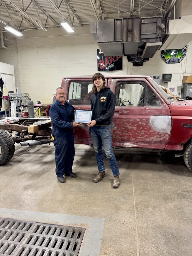 Andrew Henderson, Columbiana County Career and Technical Center’s January Student of the Month, is pictured with Rick DeSalvo, Automotive Collision Repair (ACR) Program instructor. (Submitted photo)