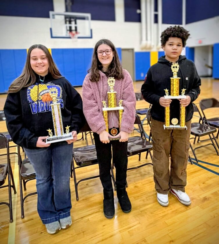 The top three finishers in the Southern Local district spelling bee held Tuesday and advancing to the Columbiana County bee in March are sixth-graders, from left, Lizzie Pierogowicz, third place; Patricia Smith, second place, and winner Knighton Hart. (Submitted photo)