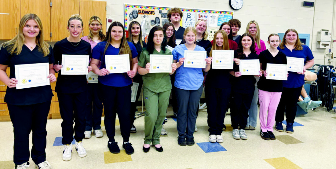 The Columbiana County Career and Technical Center Health Academy program announces the certification of its latest cohort of Patient Care Technicians through the National Healthcareer Association. All students pictured are seniors who will be completing their 2nd year of the health academy program this May. From left, front row, Breanna Weaver (Crestview), Lily Hawkinson (Beaver Local), Taylor Rogan (Beaver Local), Trinity Sturgeon (United), Paige Irey (United), Emma Forinash (Crestview), Aliva Rudebock (Crestview), Hannah Moffett (Columbiana), Alyssa Kakavros (Columbiana); back row, Madison Farrant (Leetonia), Kayli Frazier (Beaver Local), Rylee Hoover (East Palestine), Matt Lehman (Columbiana), Olyvia Barnett (Crestview), Catherine Brewer (Southern Local), Aiden Davis (Southern Local) and Grace Seeger (Columbiana). Absent from the photo are Constance Nally (United) and Danielle Shasteen (United). (Submitted photo)