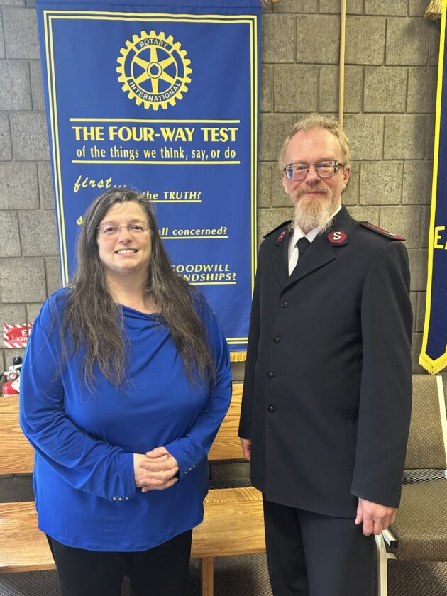 East Liverpool Rotary Club President-Elect Cathy Grafton, left, invited Major Mark Larrick of East Liverpool’s Salvation Army to speak at the recent club meeting. Larrick shared about the many activities and services that the Salvation Army provides to the community, including archery and guitar lessons free of charge. The organization also offers several holiday assistance programs and utility assistance. The Salvation Army has been serving East Liverpool for 142 years. (Submitted photo)