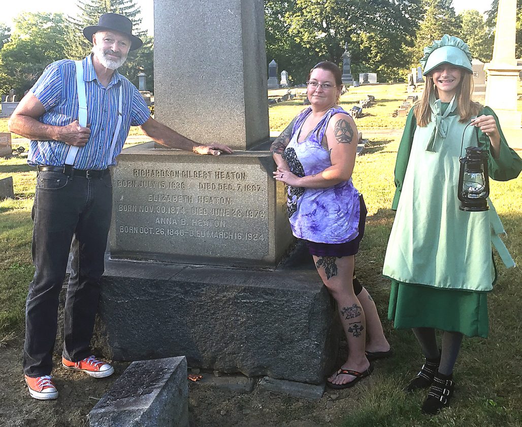 From left, Jeff Noble and Roxann Leverknight, who will portray Underground Railroad conductors Jacob and Elizabeth Heaton for the Eyes for Olivia History Walk through Hope Cemetery stand near the Heaton family monument, accompanied by Jillian Pieren, who will portray Susanna Myers, a young wagoneer, for the event next Sunday, Oct. 6. Registration begins at 5 p.m. at the cemetery chapel, with the first walk leaving at 5:40 p.m. (Photo by Mary Ann Greier)