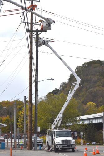 Lisbon Street in Wellsville was reduced to one lane on Thursday while crews from J.F. Electric performed work on the utility lines near the intersection of state Route 45. (Photo by Stephanie Elverd)