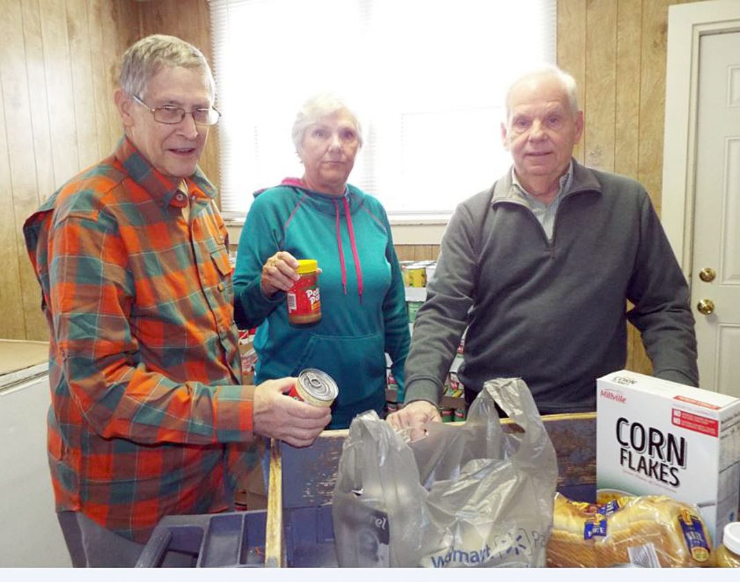 Tom Gulutz (left), FISH of East Liverpool director, assists Charlene Unger and Tom McKinney in packing a box for a food pantry patron. (Photo by Stephanie Ujhelyi)
