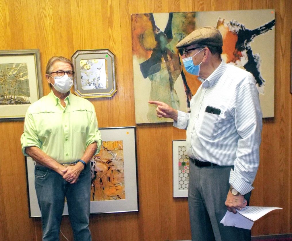 Kent Bell, who will serve as the auctioneer, looks on as Charles Lang (right) talks about his deceased sister Mary Sue, whose art and jewelry collection will be sold during the October 23 auction to benefit the East Liverpool Area Community and Learning Center. (Photo by Stephanie Ujhelyi)