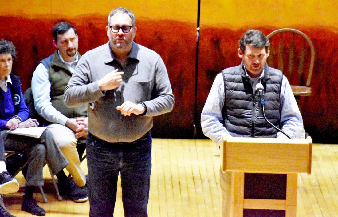 Norfolk Southern representative Darrell Wilson apologizes to residents attending a public meeting at East Palestine High School Thursday night. (Photo by Mary Ann Greier)