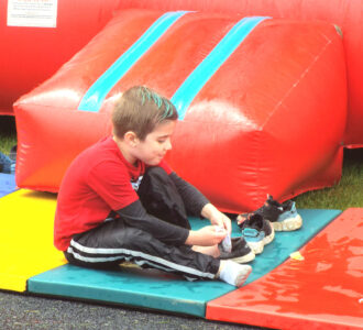Maddox Potts, the 6-year-old son of the autism event coordinator/St. Clair Township Police administrative assistant Herman Potts, puts his shoes on after exiting an extra-large bounce house. (Photo by Stephanie Ujhelyi)