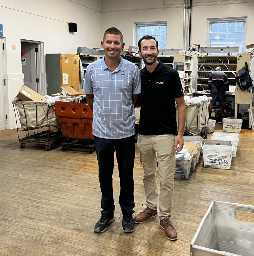 East Palestine Postmaster Lee Beight, left, and Norfolk Southern Community Liaison Jeremy Vranesevich surprised village postal workers with an appreciation breakfast Friday. (Submitted photo)