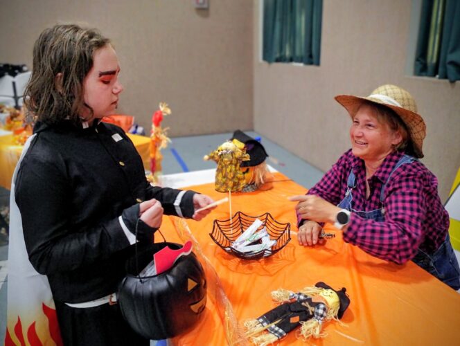 Skylynn Valentine, 10, of East Liverpool visits with Missy Taylor, a member of the city’s Northside Community Church, when she stops at Taylor’s scarecrow-themed table to pick up a fruit rollup during Saturday’s indoor farm festival. (Photos by Stephanie Ujhelyi)