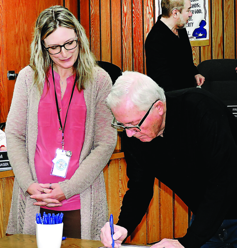 Weirton Mayor Harold Miller signs a resolution approved by Weirton Council Friday morning, authorizing an open letter to the West Virginia Division of Highways expressing concerns over the state of local infrastructure. Also pictured is City Clerk Kimberly Long.