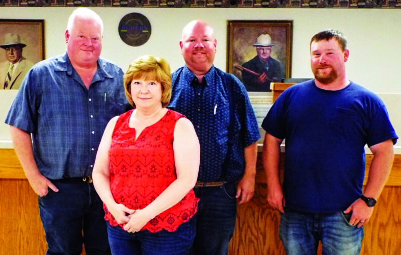 The next two generations of the Baer family pose in front of portraits of first generation Emmett Baer and second generation James Baer, their father. From left, Ken Baer, Connie Hughart, Wade Baer and Colton Hall in the corporate offices for the Rogers Community Auction and Flea Market. (Photo by Stephanie Ujhelyi).