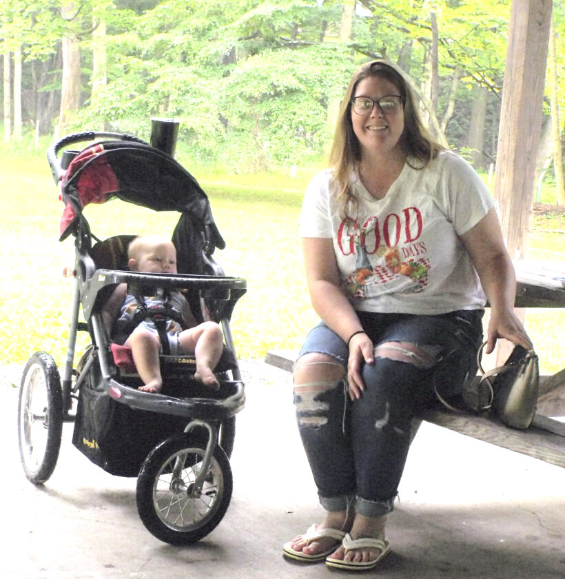 At right, Katherine Geer of Chester sits on the picnic bench next to the baby stroller containing her 11-month-old daughter Madelyn.
