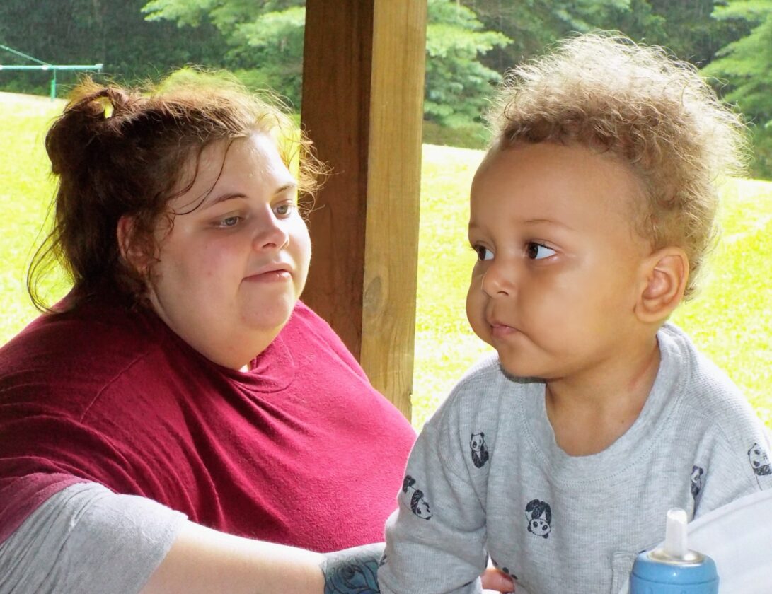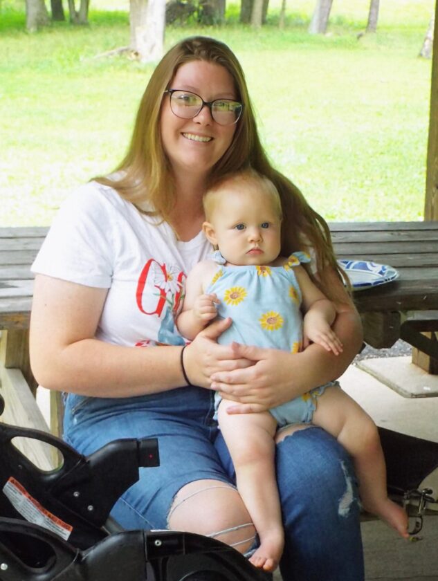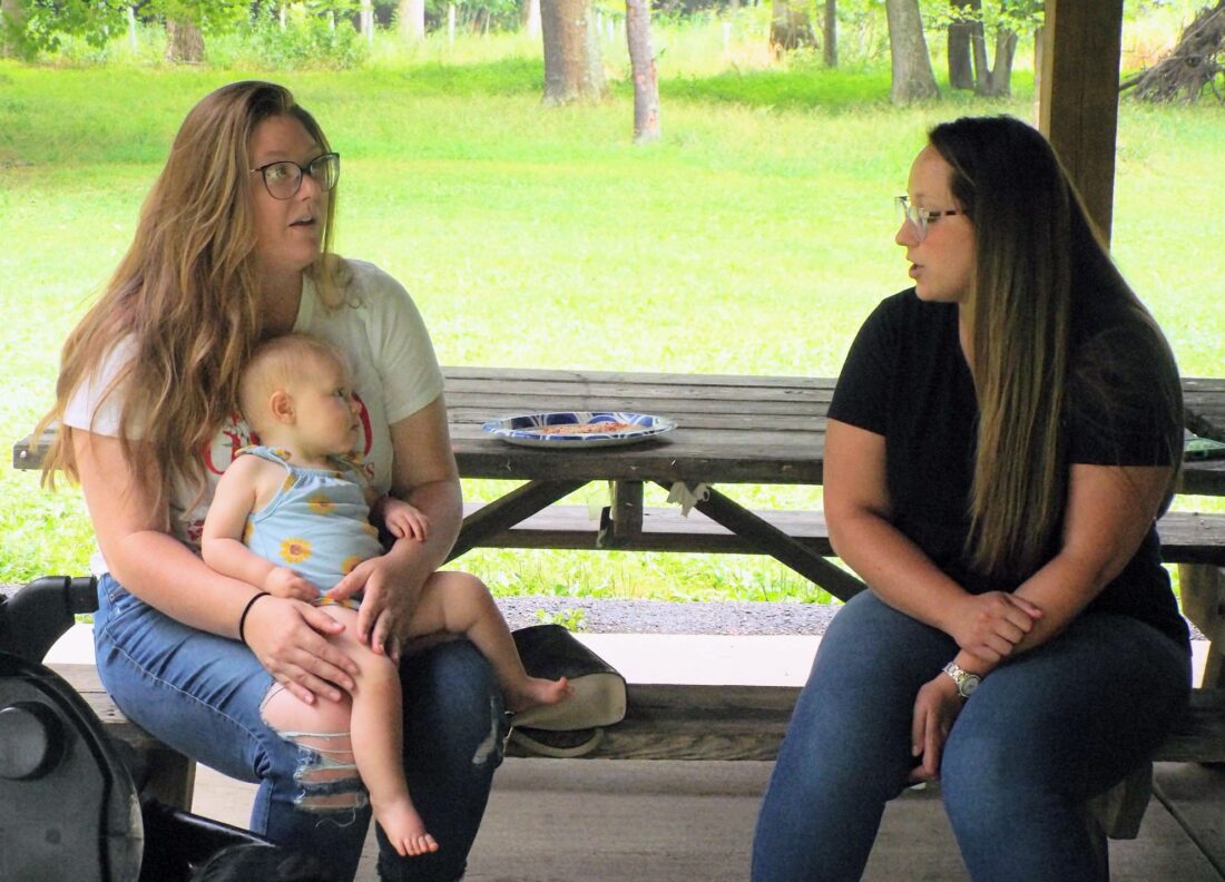 At left, Katherine Geer of Chester sits on a picnic bench with her 11-month-old Madelyn on her lap talking to Lexus Strnisa, family engagement specialist with the Hancock County Family Support Center. (Photo by Stephanie Ujhelyi)