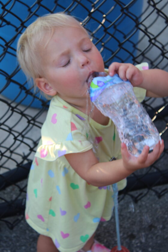 - Ruth Kinkead, 18 months, stays cool by giving a water bottle a squeeze while taking a drink from it. (Photo by Kristi R. Garabrandt)