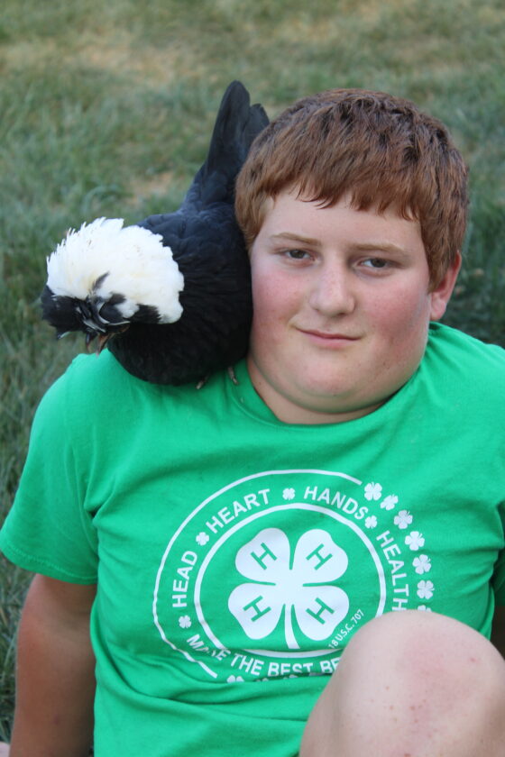 - Joel Miller, 13, Kindle Crew 4-H group, sits with his Polish White Crested Hen, Angela. (Photo by Kristi R. Garabrandt)