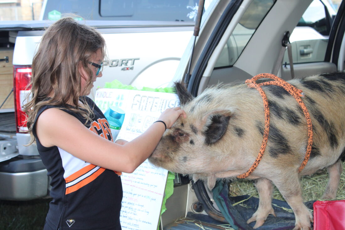 - Dakota Arrington, 10, pets Pua, a Kune-Kune pig, that was part of the petting zoo set up by local 4-H groups. (Photo by Kristi R. Garabrandt)