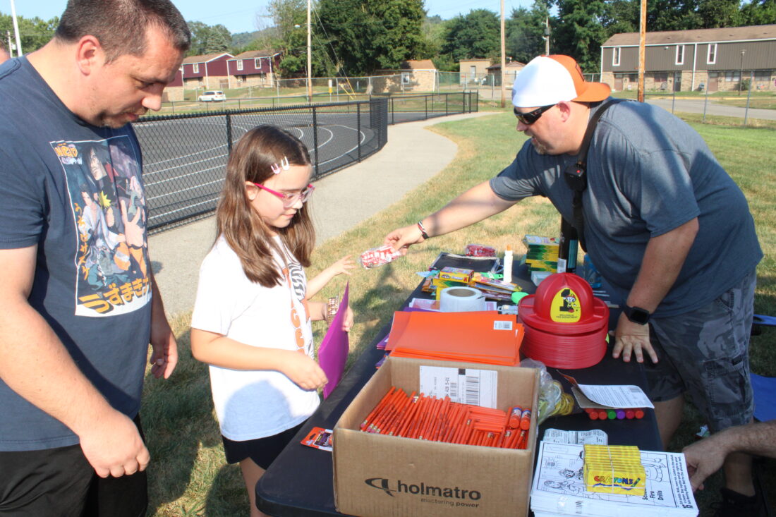 - Wellsville firefighter Brad Osborne helps Bailey Trace and her father Matthew select some back to school supplies supplied by the Wellsville Fire Department. (Photo by Kristi R. Garabrandt)