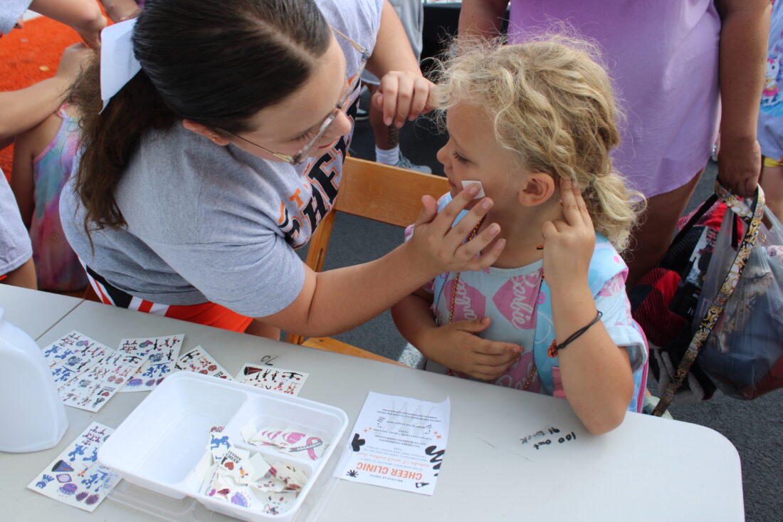 - Wellsville cheerleader Aryah Talerico, 12, puts a temporary sticker tattoo on the face of Avianna Taylor, 6. (Photo by Kristi R. Garabrandt)