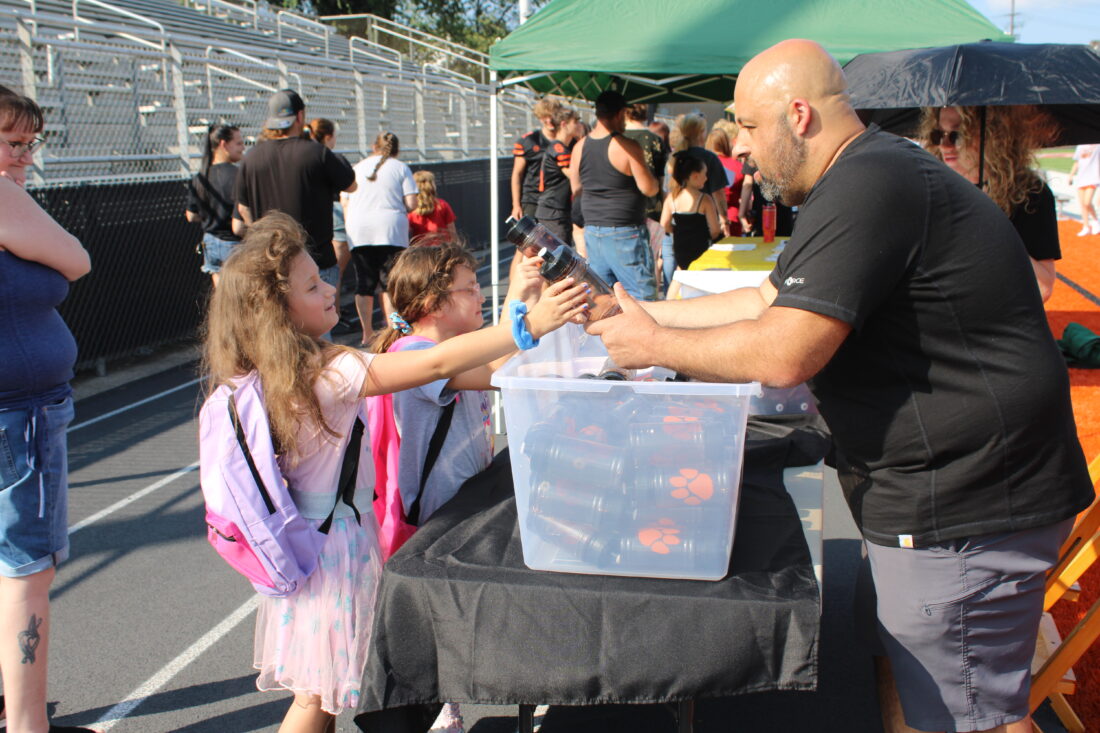 - John Geramita, Wellsville Teacher Association, hands out water bottles to siblings Alyssa, 8, and Bella, 6, Rivera. (Photo by Kristi R. Garabrandt)