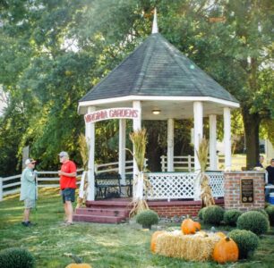 At left, John Rossy, of Guilford Lake, talks to Bill Sayers, of New Cumberland, by the Virginia Gardens’ Gazebo, where the Chester Lions Club held its annual Pumpkin Patch Saturday. Attendees also could purchase fall-themed decor items like corn stalks, bales of straw and mums or enjoy refreshments like apple cider and donuts at the four-hour event. (Photo by Stephanie Ujhelyi)