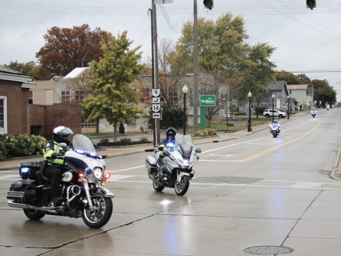 Following a public celebration of life ceremony held at Youngstown State University’s Beeghly Center Wednesday a funeral procession of first responders from across the Mahoning Valley and beyond escorted the late Trooper Nicholas Cayton, 40, from the Beeghly Center to Arbaugh Pearce Greenisen Funeral Home in Salem. The procession included units from more than a dozen emergency service agencies, and passed beneath an American flag hung from the Salem Fire Department’s ladder truck on East State Street en route to the funeral home. (Photo by Morgan Ahart)