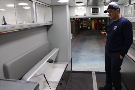 - Lt. Josh Coil shows the inside of the box that was recently overhauled and put on a new chassis to build Medic 2, the East Liverpool Fire Department’s new ambulance. (Photo by Kristi R. Garabrandt)