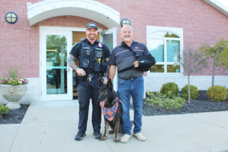 Officer and K-9 Handler Joshua Jackson and Police Chief Brian McKenzie with retired K-9 Noras. (Photo by Kristi R. Garabrandt)