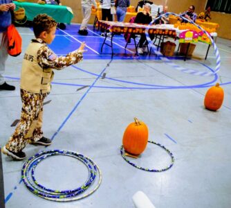 Skylynn Valentine, 10, of East Liverpool visits with Missy Taylor, a member of the city’s Northside Community Church, when she stops at Taylor’s scarecrow-themed table to pick up a fruit rollup during Saturday’s indoor farm festival. (Photos by Stephanie Ujhelyi)