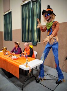 Missy and Dan Taylor, members of Northside Community Church, sit behind their scarecrow-themed table.