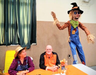 - Missy and Dan Taylor, members of Northside Community Church, sit behind their scarecrow-themed table.