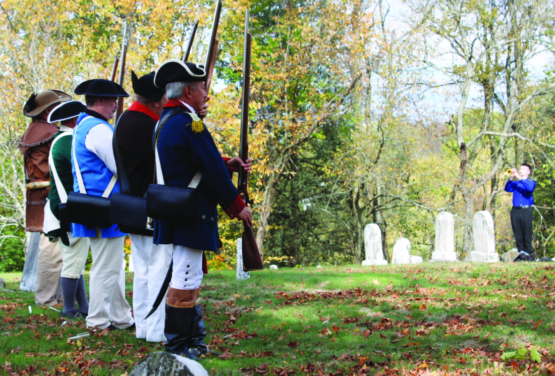 The Ohio Society Sons of the American Revolution Musket Squad stand at attention while Braydan Schwerha, East Liverpool High School Band plays “Taps” to close out the grave marking ceremony Saturday for the five Revolutionary War patriots buried at Longs Run Cemetery. (Photo by Kristi R. Garabrandt)