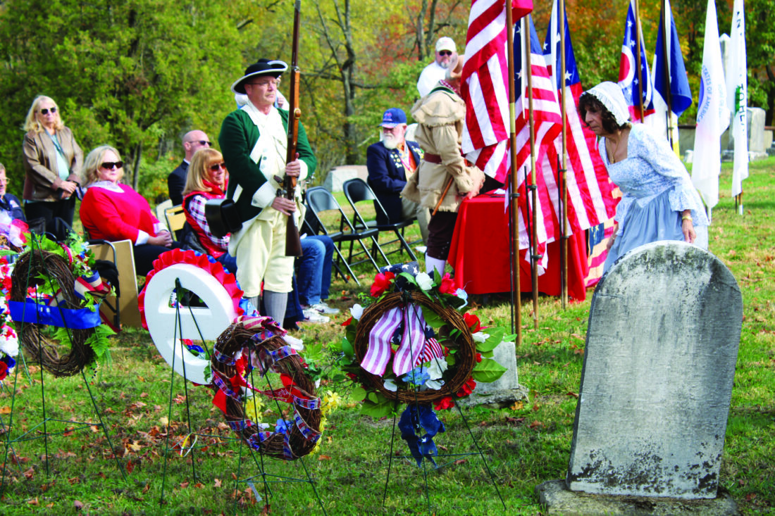 Carolyn Stepien, fourth time removed great granddaughter of Revolutionary War patriot Daniel Herbert, places a wreath at his gravesite in the Longs Run Cemetery, East Liverpool, Ohio, during a grave marking ceremony for the patriots. (Photo by Kristi R. Garabrandt)