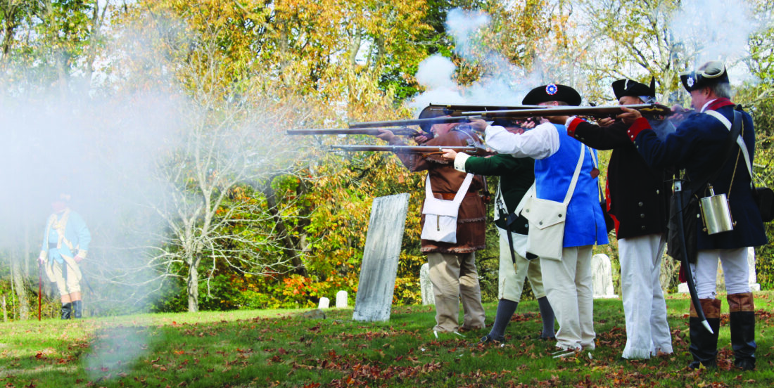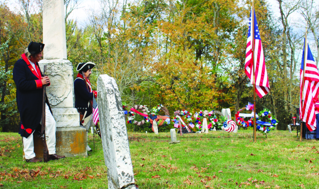 (Above) Ohio Society Sons of the American Revolution Color Guard prepare to post the colors at the beginning of a grave marking ceremony for five Revolutionary War patriots buried at Longs Run Cemetery, East Liverpool on Saturday. (Right) The Ohio Society Sons of the American Revolution Musket Squad give a 21-gun salute to close out the grave marking ceremony. (Photos by Kristi R. Garabrandt)