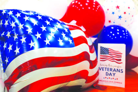 - Patriotic-colored balloons decorate the gym at the Wellsville Jr. Sr. High School to honor area veterans during the school’s annual Veterans Day program. (Photo by Kristi R. Garabrandt)