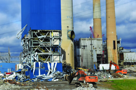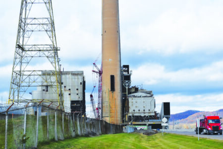ismantling and scrapping of the former W.H. Sammis Power Plant, just south of Wellsville, continues by B&B Wrecking and Excavating. Most outlying buildings have been torn down and the tunnel that directs traffic on Ohio state Route 7 beneath the smoke stacks, is no longer attached to the main facility. The coal-fired power plant closed in May 2023, resulting in the loss of 140 jobs and marking a shift away from coal-powered energy, as its owner at the time, Energy Harbor, transitioned to carbon-free nuclear power. (Photos by Stephanie Elverd)