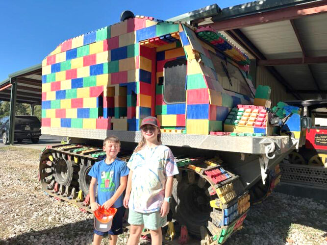 Linus and Evelyn Reed explore a Lego Block truck prop on set while filming a YouTube video in Houston, Texas. (Submitted photo)