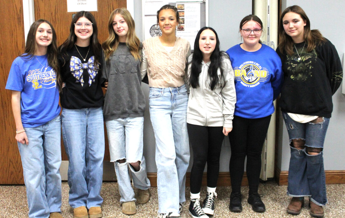 The Southern Local Middle School Principal’s Advisory Council was introduced during the regular Southern Local Board of Education meeting Nov. 11. The student panel meets regularly and is working to promote student council and create activities. Members include, from left, Lydia Tsesmilles, Sadie Plunkett, Gemma Jackson, McKenzie Sloan, Ellieannia Madden, Miah Cote and Nevaeh Todd. Not pictured are Nikyah Rickerd and Jorden Sevek. (Submitted photo)