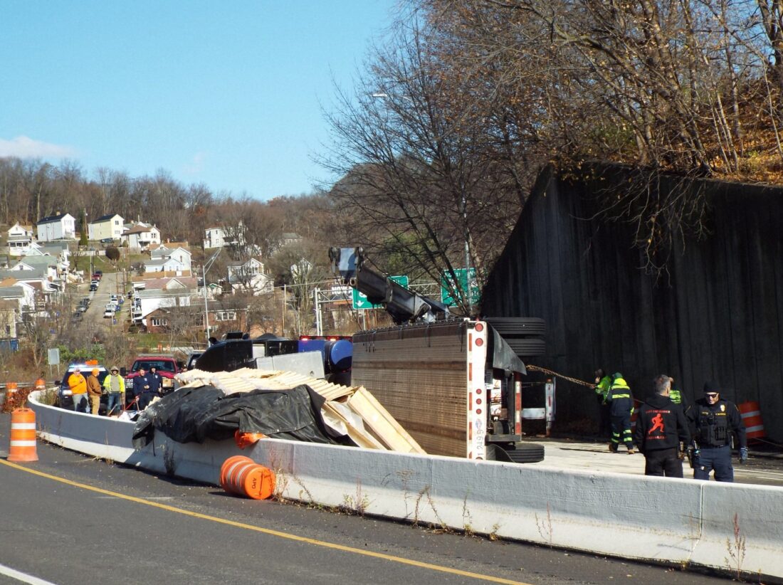 A portion of state Route 11 between the Downtown East Liverpool and Wellsville northbound entrances was closed several hours Wednesday as crews removed an overturned tractor trailer. According to a dispatcher, a Erie Towing truck was brought in to assist First Class Towing to clear the wreckage from the northbound lane of the Route 11 Wellsville entrance ramp. As of 3 p.m, five hours after a passerby reported the incident to safety forces, East Liverpool police and fire forces were still on scene of the closed section of highway. The unidentified truck driver was not transported to the hospital, according to East Liverpool police chief John Lane. (Photo by Stephanie Ujhelyi)