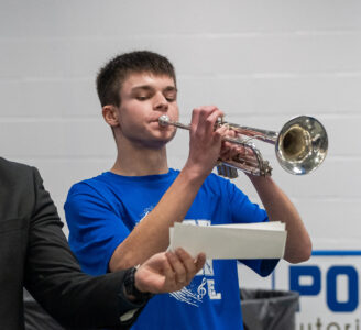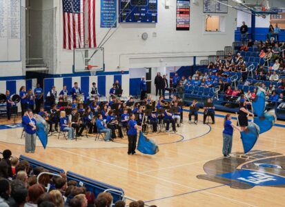 The ELHS Pride In Stride Marching Band, led by Director of Bands Mr. Joshua Sipe, fills the Fieldhouse with patriotic pride through their stirring performance of “Spirit of America.”
