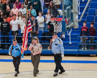 ELHS Senior and Eagle Scout candidate Elijah Grogg presents the colors with dignity and precision as the Potter Fieldhouse rises in respect for veterans and active-duty service members.