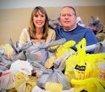 Angie and John Lane pass out grocery bags containing canned goods like ravioli and Spam on behalf of the Women Of The Word during their inaugural Thanksgiving meal Sunday at the Hancock County Senior Center. If John Lane looks familiar, it is probably because his day job is as East Liverpool city police chief across the river. (Photo by Stephanie Ujhelyi)