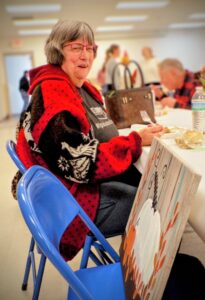 Joyce Andrews, of New Cumberland, enjoys a plate of turkey dinner Sunday, after attending a luncheon and sip and paint activity next door at the Hancock County Senior Center. This was the first sit-down dinner hosted by the Women of the Word non-profit organization this year. (Photo by Stephanie Ujhelyi)