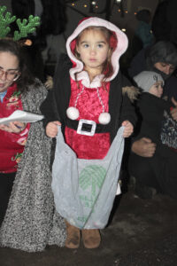 - Camri McDole, 3, dressed in a festive Christmas outfit stands along the parade route with a bag ready to catch the candy thrown by parade participants. (Photo by Kristi R. Garabrandt)