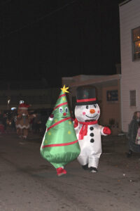 An inflatable snowman, Christmas tree and gingerbread man dance their way through the parade route taking breaks to interact with children watching the parade. (Photo by Kristi R. Garabrandt)