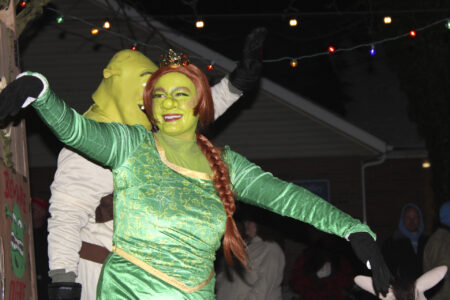 Fiona and Shrek dance while waving to those watching the Christmas parade. (Photo by Kristi R. Garabrandt)